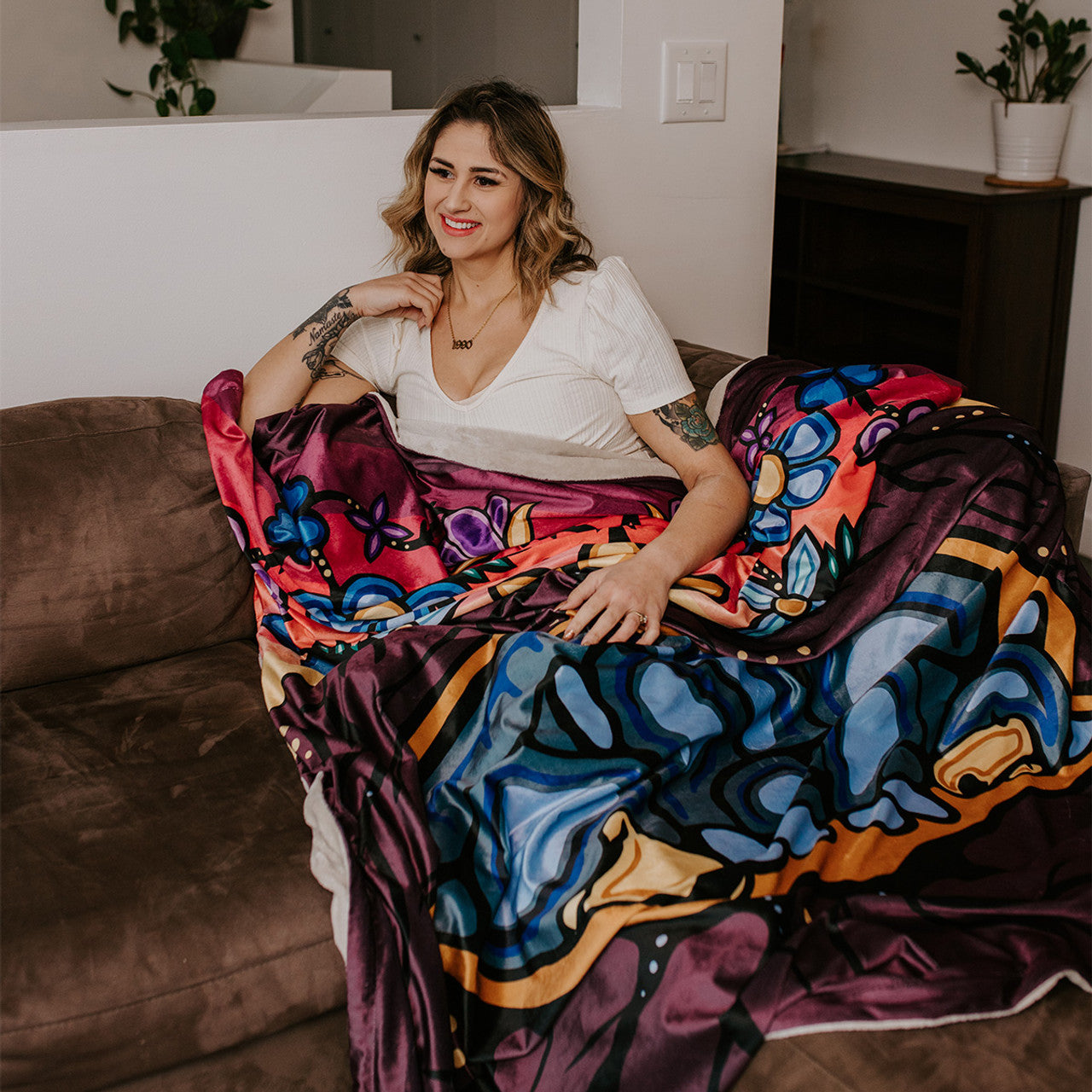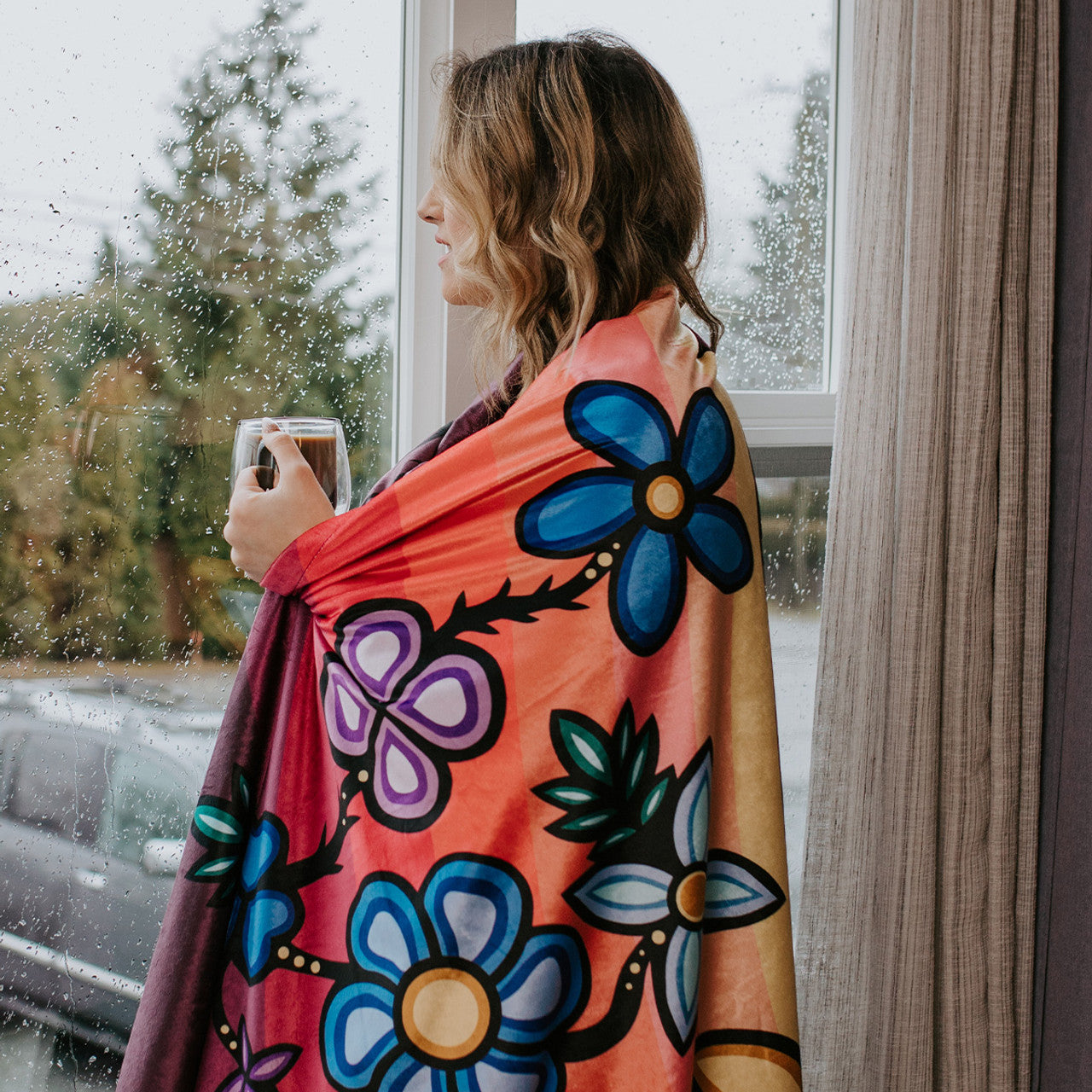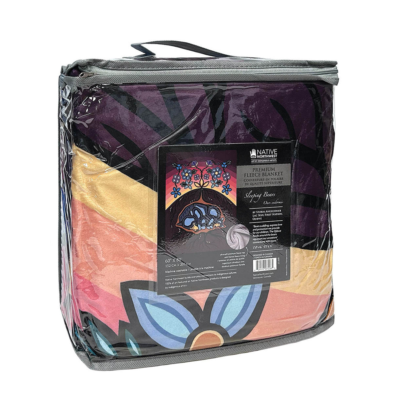The Premium Fleece Blanket - Sleeping Bears by Storm Angeconeb is a luxurious 60" x 80" velour-style blanket crafted from 100% polyester. Featuring exquisite Indigenous artwork, this double-layered blanket combines a flannel-fleece inner lining with a shimmering Premium Fleece top, delivering exceptional softness and warmth. Designed for ultimate comfort, it’s ideal for home use, ceremonial occasions, or thoughtful gifting, blending cultural artistry with plush, velvety texture.