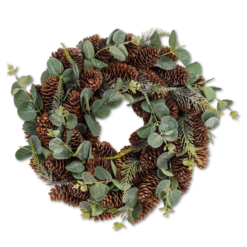 Add some rustic, natural style to your seasonal decor with this picturesque Pinecone Wreath with Eucalyptus. Crafted out of natural materials and styro, this wreath comprised of bundled pinecones and eucalyptus leaves makes an elegant, natural accent to any entranceway.