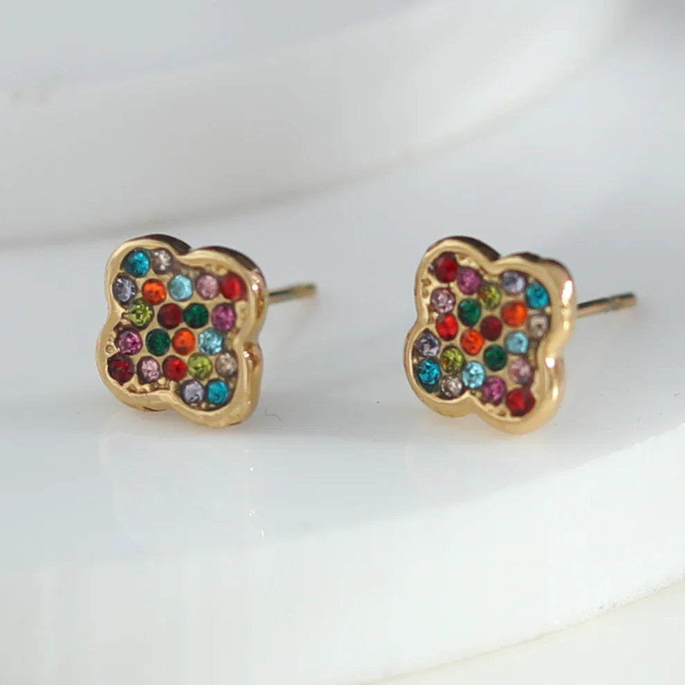 Glam up with GOLDIE 2215! These multi-colored vintage-inspired stud earrings are just the right amount of sparkle for any look, taking you back to the elegance of the 1920s. Crafted from eco-friendly metal and layered in 18K gold, you'll be free of nickel, lead, and cadmium worries - and your skin won't turn green! The AAA zirconia glows in gold, adding a luxurious hue to your outfit. Dress up or dress down - these earrings are perfect for any occasion.