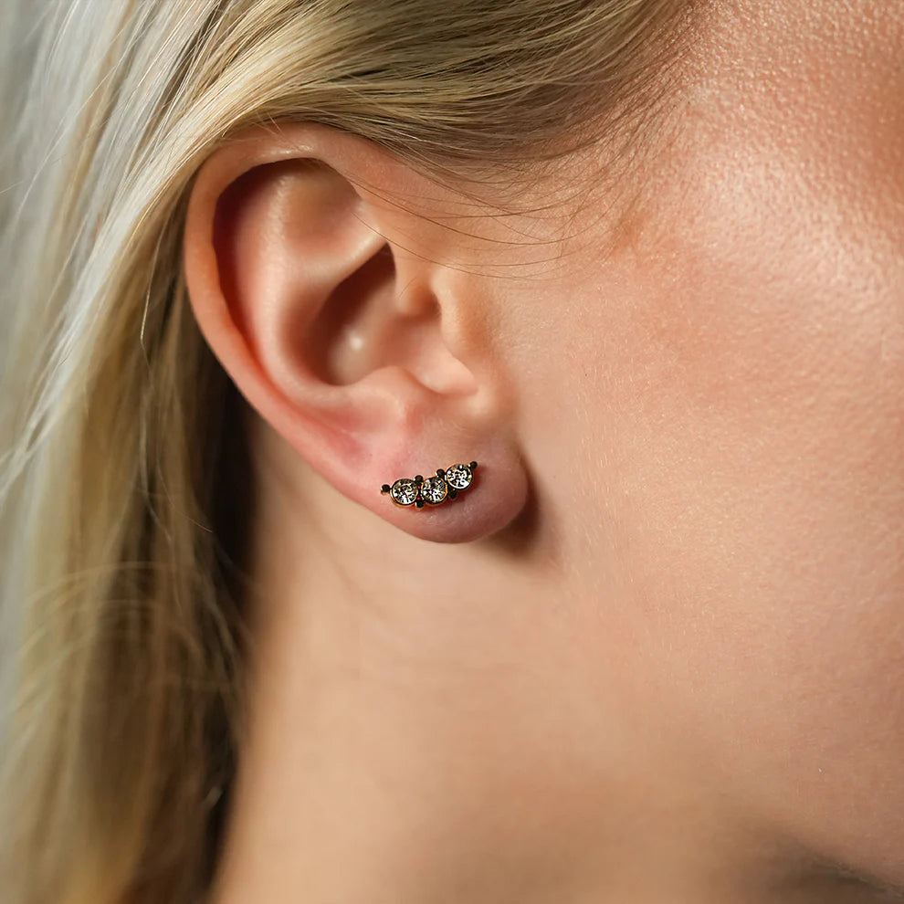 Style GRACE 21024: Trio of Zirconia Stud Earrings. Less is More. These delicate stud earrings shine with a trio of dazzling zirconia gemstones on a curved design. Timeless and elegant. Made with Hand Forged Graded Metal Coated in Pure 18 Karat Gold. No Nickel, Lead or Cadmium. Non-Allergenic and won't create a "green" reaction on skin. Perfect for dressing up or down - Shine in Gold: A Luxurious Hue achieved with Pure 18 Karat Gold Plating. Includes a Complimentary Pouch made of Vegan Suede for Safekeeping.