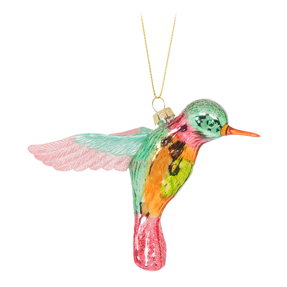 Add some colour to your holiday decor with the help of this captivating Hummingbird Ornament. Crafted out of glass, this gleaming ornament looks just like its real-life counterpart with vivid reflective pink, turquoise and orange hues to help make any Christmas tree shine.