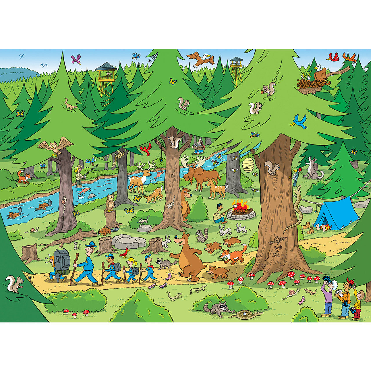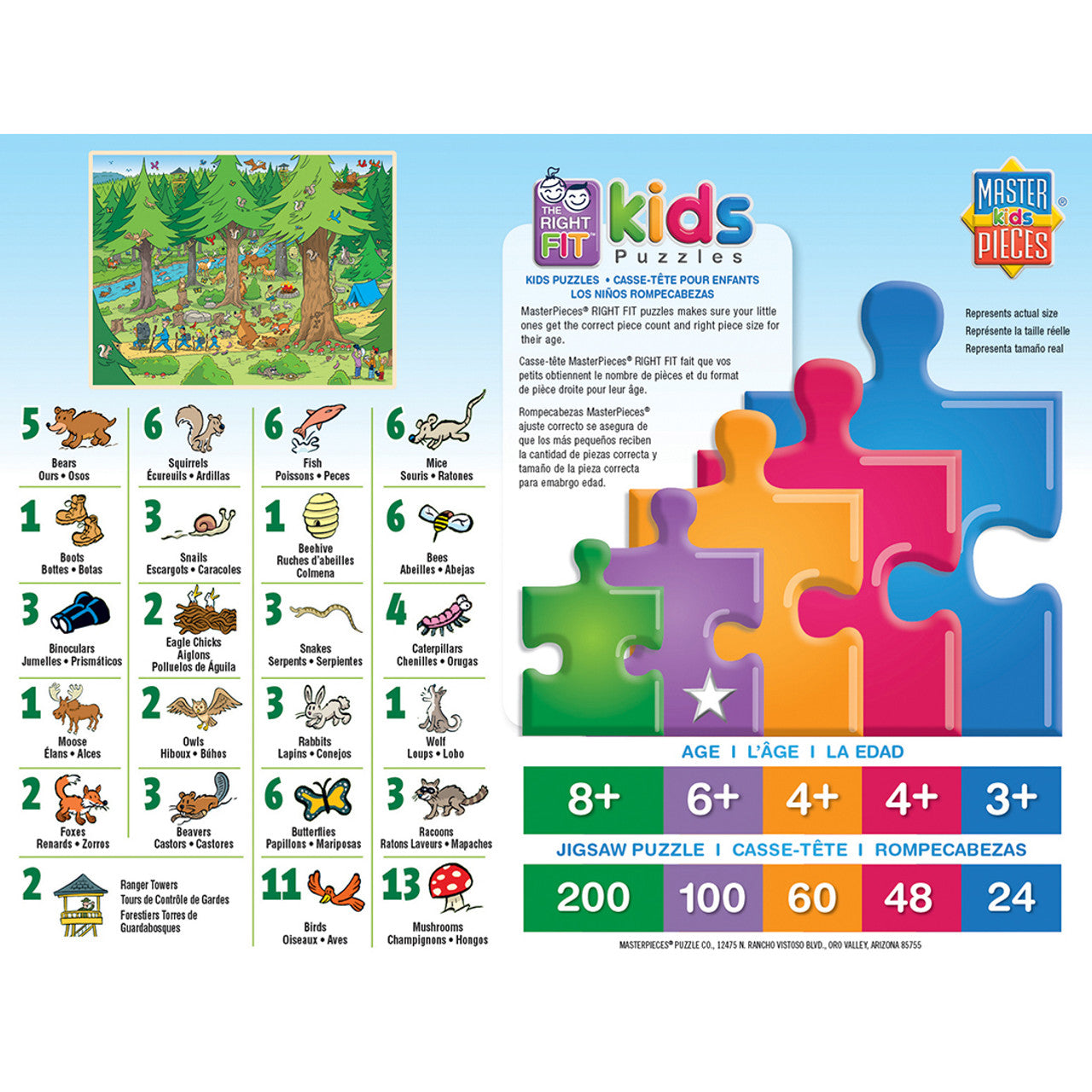 Let the search begin with this 101 Things to Spot in the Woods puzzle. There are 101 things to spot in these woods, from bears to squirrels, and even some baby eagle chicks. Can you find them all? Good luck! This puzzle is 101 pieces and 19 inches x 14 inches in size. Look for The Right Fit® puzzles collection and make sure your little one gets the correct piece count and size for a good challenge for their age. This puzzle is the right fit for ages 6+.