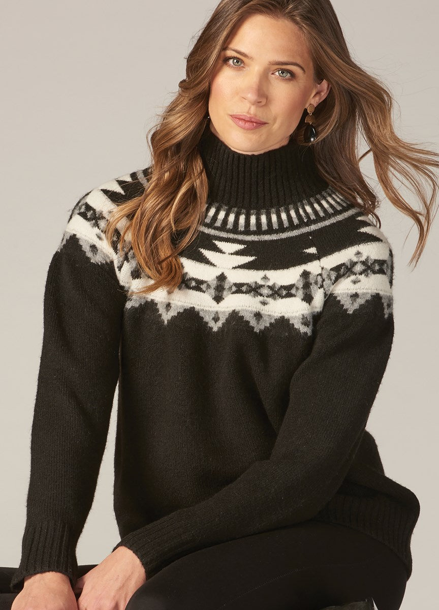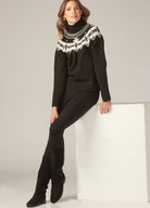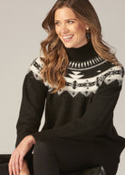 Après Ski in a raglan long sleeve pullover, tall mock neck with a beautiful engineered yoke winter themed jacquard, straight silhouette, fantastic relaxed fit all knit in a soft plush yarn. Whether you hit the Chalet or the shops, you will look great! Black. Machine wash gentle, lay flat to dry. 74% Acrylic, 22% Polyester, 4% Elastic.