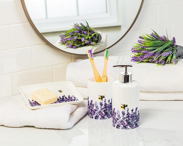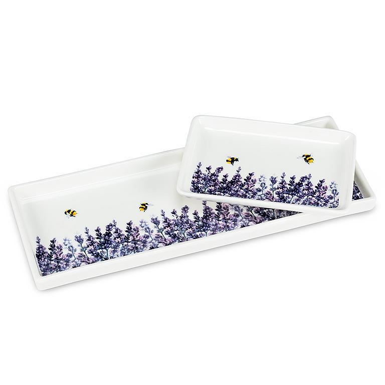 Add elegance to any occasion with this beautiful Lavender Rectangle Plate. Crafted out of stoneware, this rimmed plate features a stunningly painted field of lavender by buzzing bumblebees – the perfect way to serve anything from appetizers to dessert. Other lavender/bee-themed accessories also available.