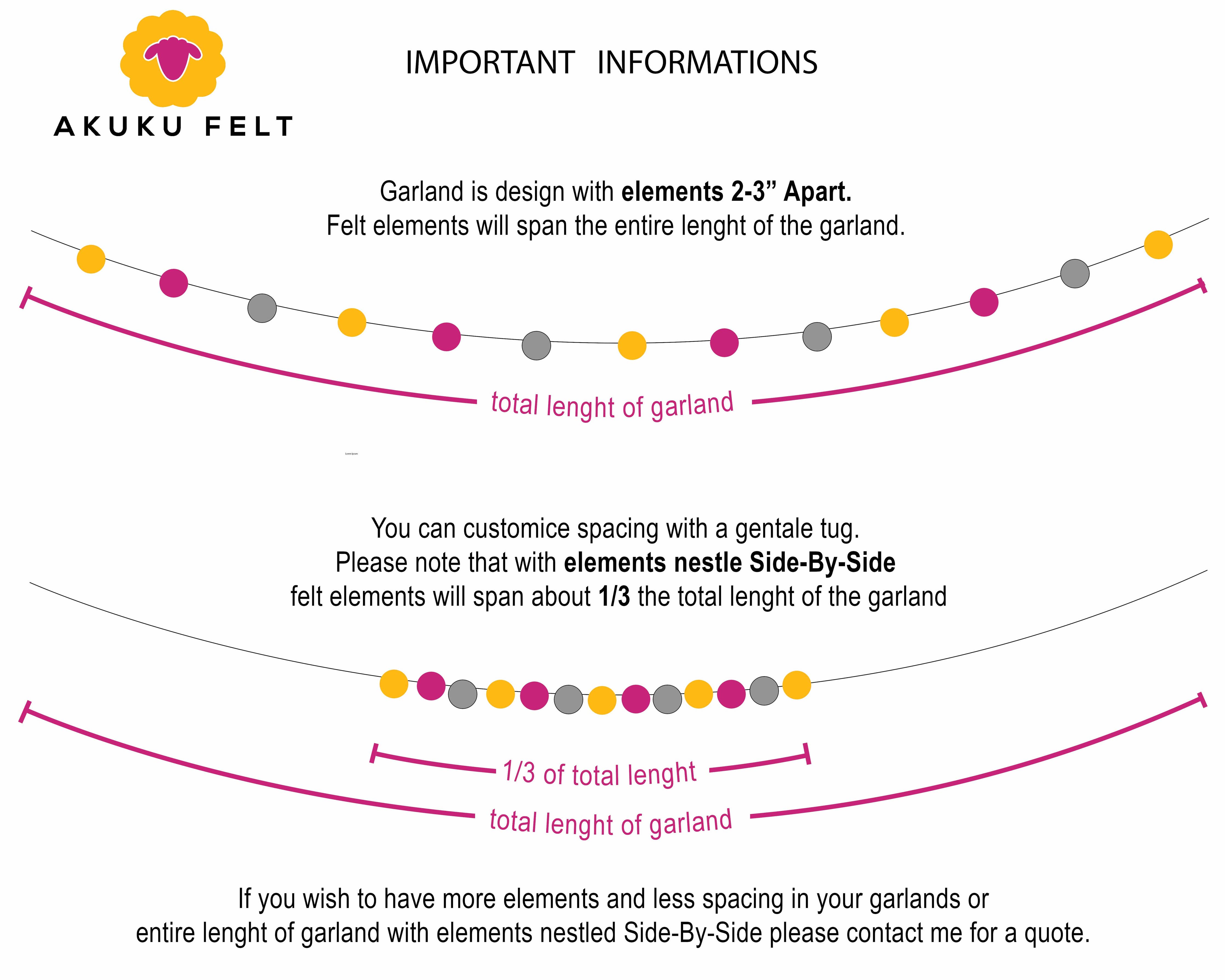 This unique garland is hand-made with 100% wool making it the perfect decoration for your home, office or parties. Our Garlands are completely non-synthetic, eco-friendly, and biodegradable. Proudly made in Canada by Woman own business. Details Our products are handmade with the highest quality 100% merino wool from New Zealand. Each of the balls is sewn on the twine but there are no knots holding the felt ball in place. That allows you to customize the position of your felt balls with a gentle tug. Garland ends with a loop for easy hanging. Our products are for decoration purposes only. Akuku Felt is a Mom's own business.
