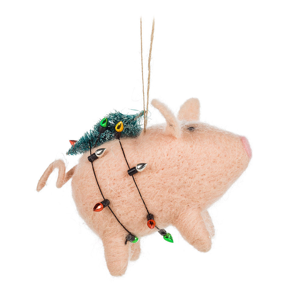Decorations don’t come much cuter than this festive Pig with Lights Ornament! Crafted out of polyester and wool, this plush piggy is doing his best impression of a Christmas tree — complete with colourful lights and tinsel tree strapped to his back — to make an adorable addition to yours. Other plush ornaments also available..