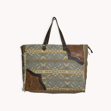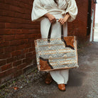 Bag made up of cotton rug, canvas and buff leather & hairon with brass hardware accessories |