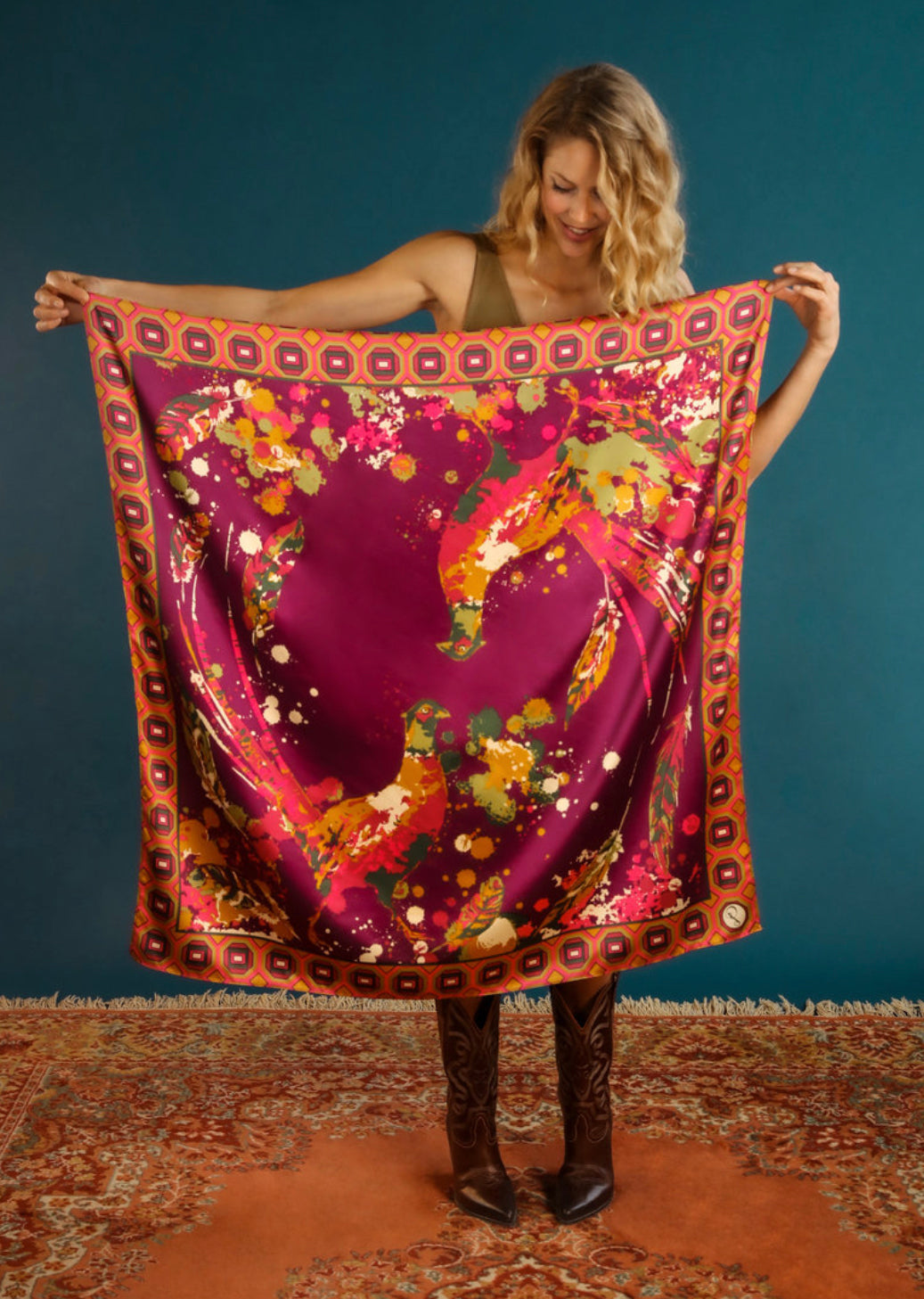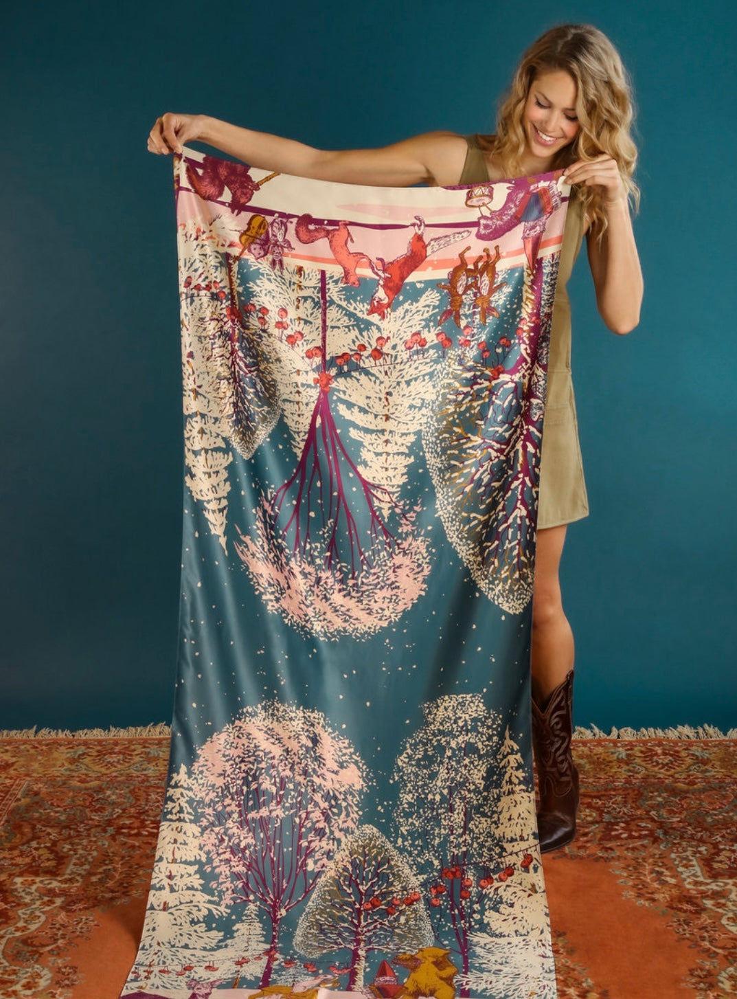 Can you hear the distant sound of music and joy floating on an Autumn breeze? Peek through the branches to see a collection of Powder critters enjoying a Forest Party on this beautiful Satin Scarf! Large enough to wrap in several ways, this one will be a conversation starter. Ships with complimentary Powder packaging.
