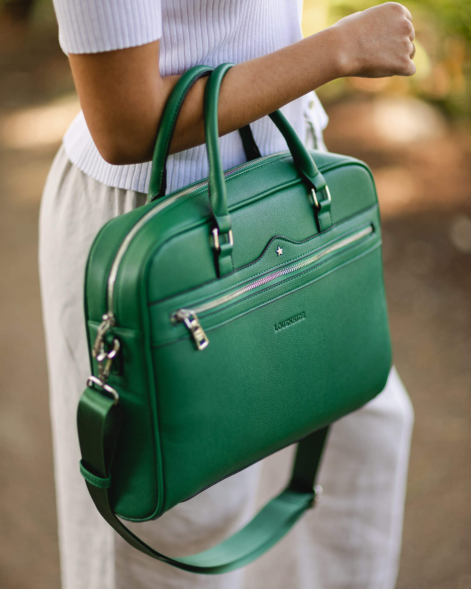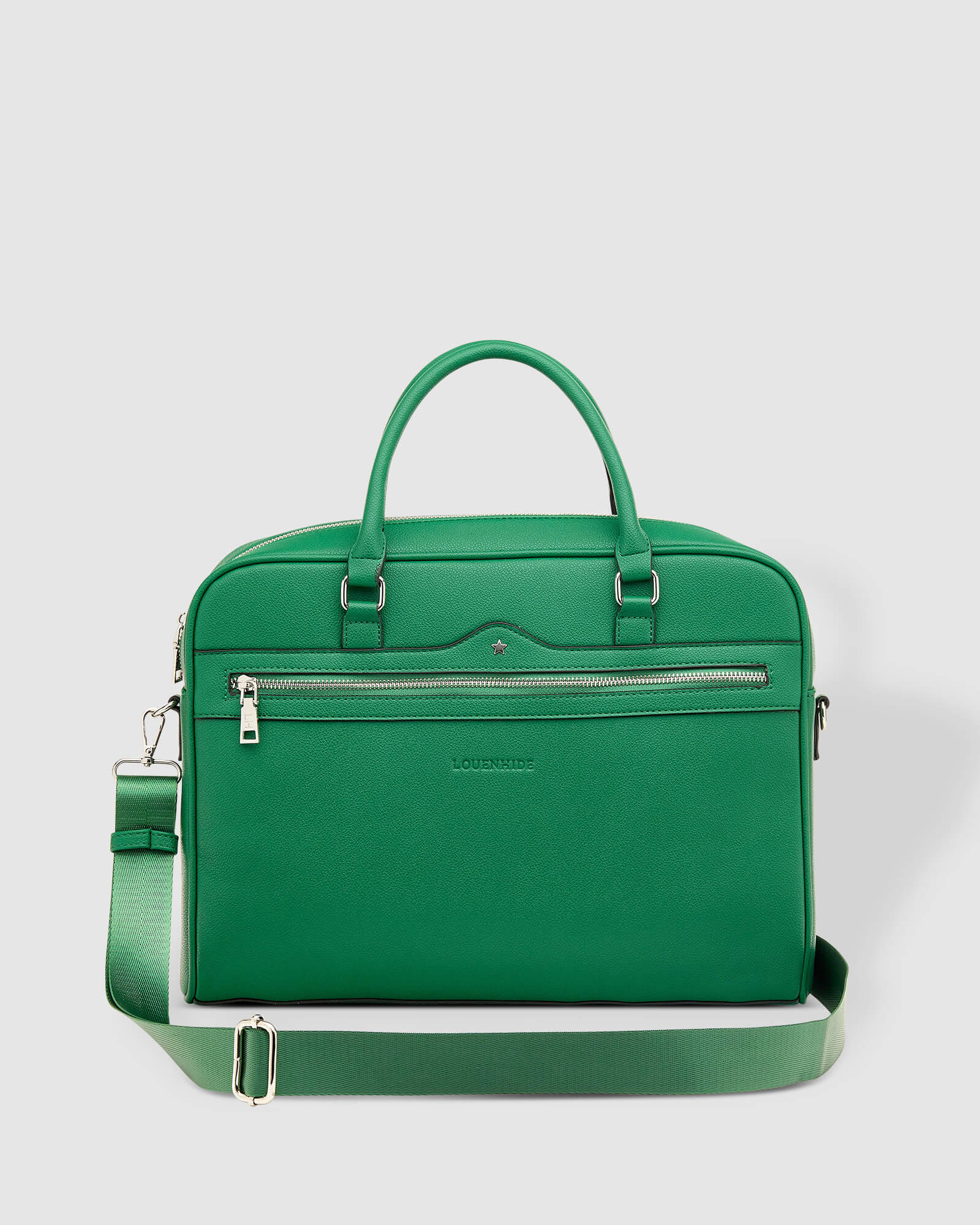 The Louenhide Portland Laptop Bag is a sleek and professional laptop carrier, perfect for business women on the go. Stylish from top to bottom, the rectangular shaped silhouette is built to last, featuring a structured polyurethane vegan leather exterior and statement silver star hardware that adds a touch of luxury to the design. Fit up to a 16-inch laptop in this case with a built in laptop divider to keep your electronics secure. The Portland includes an interior zip pocket and front and back side zip pockets on the exterior for your smaller office essentials. Choose to carry in your hand as a briefcase or attach the adjustable and detachable extension webbing strap to wear on your shoulder for more mobility.