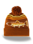 Celebrate lakeside traditions and love for the outdoors with this Rainbow Trout Knit Beanie Winter Hat with Pom Pom. Featuring a bold, colorful trout motif across the front and retro-inspired stripes in olive, mustard, and pink, this beanie brings a splash of personality to your winter gear. The ribbed fold-over cuff adds a cozy textured detail, while the fluffy pom pom finishes it with playful warmth.