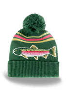 Celebrate lakeside traditions and love for the outdoors with this Rainbow Trout Knit Beanie Winter Hat with Pom Pom. Featuring a bold, colorful trout motif across the front and retro-inspired stripes in olive, mustard, and pink, this beanie brings a splash of personality to your winter gear. The ribbed fold-over cuff adds a cozy textured detail, while the fluffy pom pom finishes it with playful warmth.