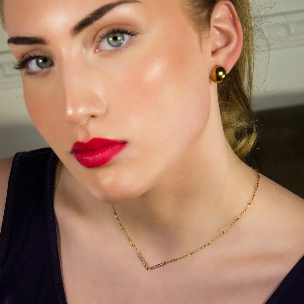 Introducing the SANITA 9712 necklace! This quirky and fun piece features a dainty chain adorned with a 'V' shaped pendant embedded with sparkling zirconia gemstones. Let your inner fashionista shine with this modern and elegant design. Made from premium base metal and coated in luxurious 18 karat gold and silver tones, it's water-resistant and tarnish-free. Plus, it's non-allergic, non-toxic, and free of harmful metals. And don't forget the rhythmic pattern created by the beads on the chain, catching the light with every move. This necklace is a unique statement piece, not just an echo of others.