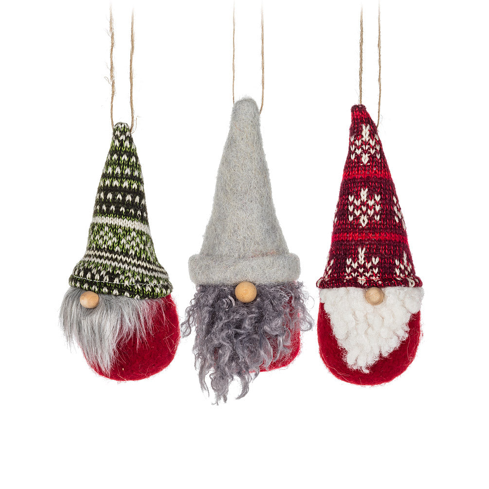Gnomes have graduated from the garden to the Christmas tree, starting with these three adorable assorted Extra-Small Gnome Ornaments! Designed exclusively for Abbott, these plush ornaments crafted from polyester and wool are full of delightful details, from their unique long beards to their distinctive knit hats. Alone or together, they make a fun and festive addition to your holiday decor. Larger versions also available.